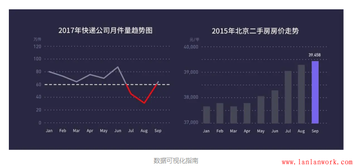 (1)比較數(shù)據(jù)差異情況?;诜诸惖臄?shù)據(jù),可以通過比較數(shù)據(jù)來了解不同分類的差異,比如柱狀圖。基于流程的數(shù)據(jù),可以通過比較數(shù)據(jù)了解數(shù)據(jù)的變化趨勢,比如折線圖。