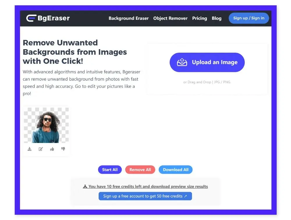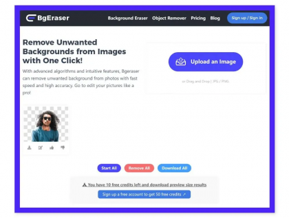 一個(gè)專注于 AI 摳圖網(wǎng)站,支持批量處理。上傳圖像后點(diǎn)擊 start 開始處理圖像,摳圖時(shí)間在 30s 左右。新用戶有 10 次的免費(fèi)摳圖額度,注冊(cè)登錄后額度可以上升至 50 次。