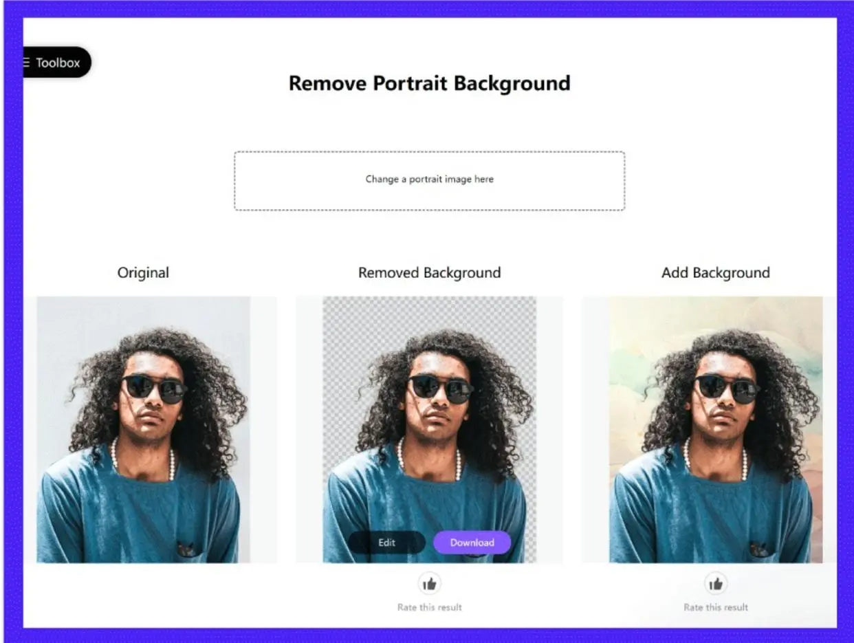 Toolkit 是一個(gè)多功能的圖片處理網(wǎng)站,其中就包括一鍵人像摳圖的功能。同樣是免費(fèi)使用,無需登錄注冊(cè)。進(jìn)入網(wǎng)頁后,上傳本地圖像網(wǎng)頁就會(huì)開始自動(dòng)處理,支持為摳圖后的人像添加自定義背景。