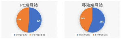 在美國一份針對(duì) 50 家頂級(jí)零售電商網(wǎng)站的統(tǒng)計(jì)中,發(fā)現(xiàn)輪播圖被廣泛運(yùn)用于電商網(wǎng)站:PC 端 52%的電商網(wǎng)站使用輪播圖,而與此同時(shí)移動(dòng)端 56%的電商網(wǎng)站使用輪播圖。(以下圖表是譯者個(gè)人為方便大家理解制作的)