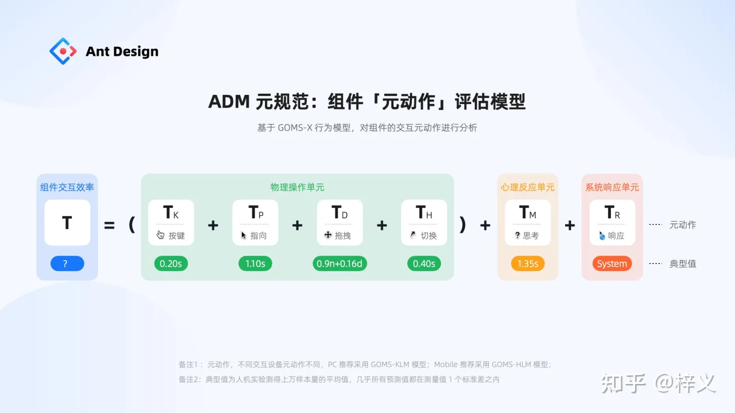ADM 元規(guī)范的組件評估模式正式基于 GOMS 人機交互模型演變而來。GOMS 是 1983 年 Card 等人在《The Psychology of Huamn Computer Interaction》首次提出的一種交互建模方法,它的核心理念是將用戶與界面交互行為拆解為行為元動作,無需真實用戶介入就能預測交互行為的序列,評估交互的質量。