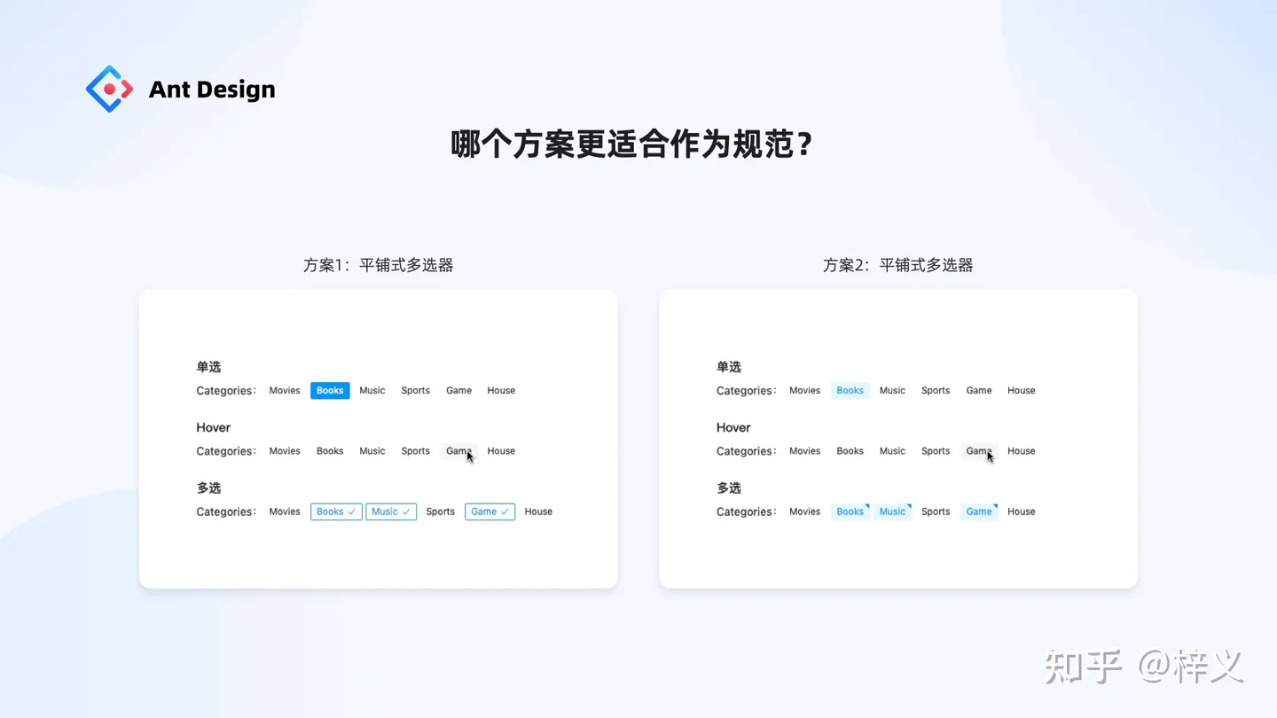 以我們開篇第四個問題提到的組件「平鋪式多選器」為例,我們到底該選哪個方案作為規(guī)范納入設計系統(tǒng)當中呢?