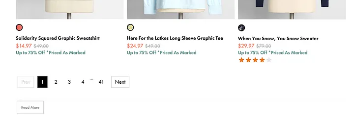 據(jù)我所知,無限流是由播客《Your Undivided Attention》的聯(lián)合主持人Aza Raskin發(fā)明的。他在2006年為一家名為“人性化”的用戶界面公司工作,那個(gè)時(shí)候人們還在使用“分頁(yè)”的設(shè)計(jì),而他則想創(chuàng)建一種能夠取替分頁(yè)的方法。分頁(yè)是將內(nèi)容切割成幾個(gè)頁(yè)面,通過底部的導(dǎo)航欄頁(yè)簽選擇可以跳轉(zhuǎn)的頁(yè)面,我們現(xiàn)在仍然能在一些電商網(wǎng)頁(yè)版中看到這種設(shè)計(jì)的蹤影,如下圖所示。