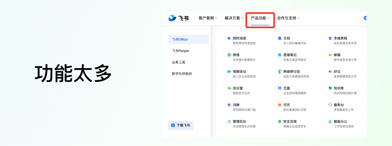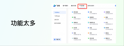 去哪里了解呢?一般企業(yè)官網(wǎng)都會(huì)把自家產(chǎn)品列出來,方便客戶查看,咱們也可以順著這條路線去走。就拿飛書舉例,從導(dǎo)航欄的“產(chǎn)品功能”我們可以看到,主要是四條線,咱們不用把每條線都挖得很細(xì)致,但是起碼要有大概的認(rèn)知,知道這是個(gè)什么東西,做什么的,最好上手體驗(yàn)體驗(yàn)。