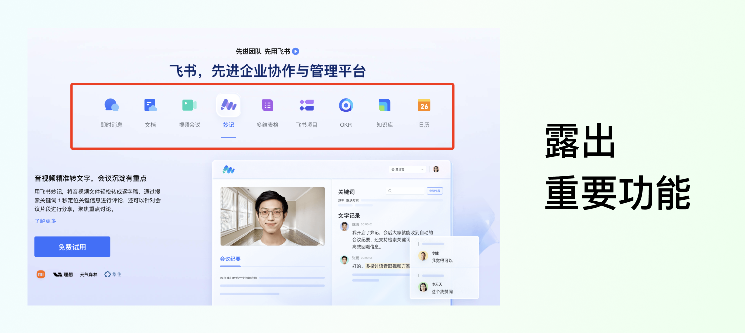例如飛書在未登錄用戶的首頁(yè)黃金位置,把重點(diǎn)功能單獨(dú)強(qiáng)調(diào),在登錄用戶的導(dǎo)航欄和頭部的位置都做了這些功能的露出。反復(fù)強(qiáng)調(diào)和露出,重要程度不用我多說了吧。
