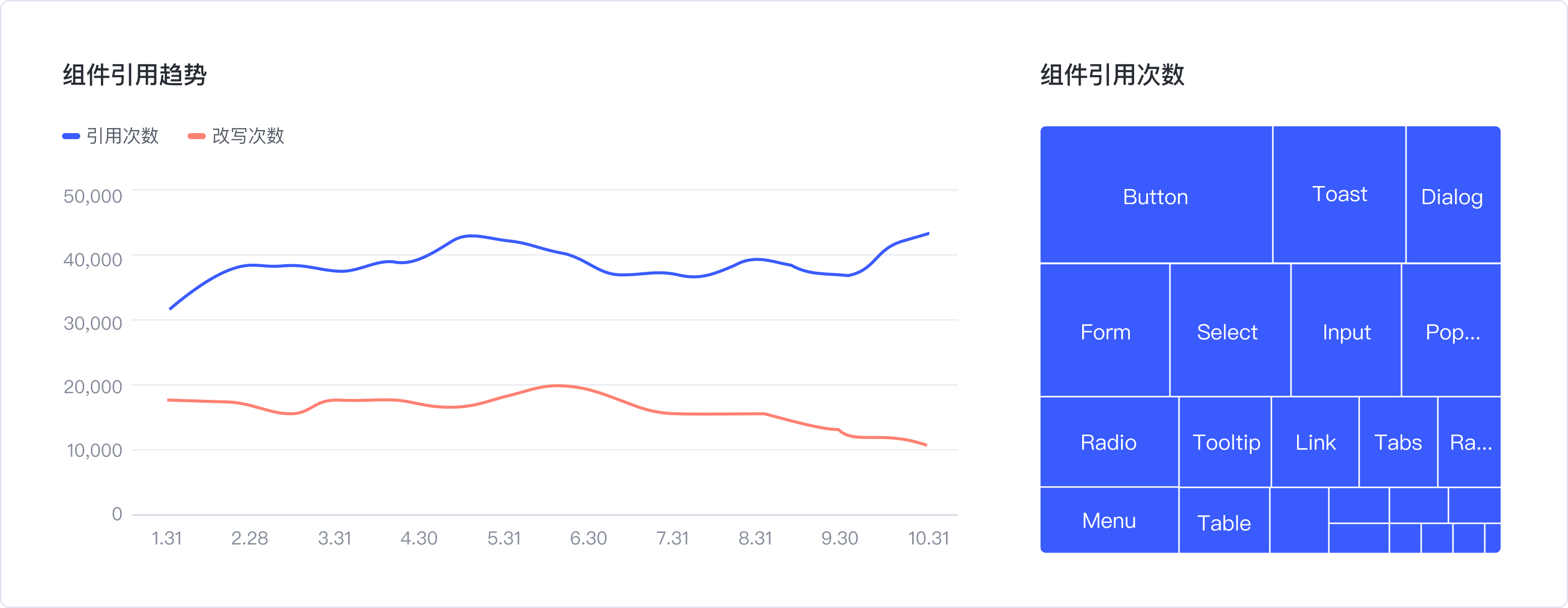角色二是引用方,也就是各個業(yè)務(wù)平臺的設(shè)計師、研發(fā)同學(xué)。他們會在日常的需求消化中,引用組件完成功能迭代。我們希望通過這些引用的行為觀測組件庫的覆蓋能力,提前預(yù)知不易用的風(fēng)險組件,盡早升級。于是就有了以下2個維度: