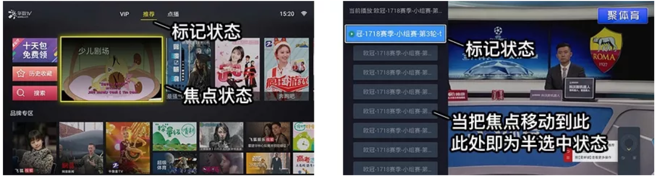 可能需要簡(jiǎn)單講述一下“標(biāo)記狀態(tài)”和“半選中狀態(tài)”:“標(biāo)記狀態(tài)”在PC和手機(jī)端也非常常見(jiàn),比如告知用戶所在位置在哪里的Tab標(biāo)記;而“半選中狀態(tài)”是“焦點(diǎn)狀態(tài)”的一種情況,即移動(dòng)到某個(gè)焦點(diǎn)后,不進(jìn)行加載或觸發(fā)操作,需按“OK鍵”才觸發(fā),如圖15所示。這種狀態(tài)在早期電視盒子性能不足、在Tab切換時(shí)經(jīng)常需要使用,因?yàn)槿绻苯忧袚Q焦點(diǎn)時(shí)就加載,可能會(huì)造成卡頓。