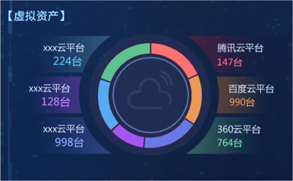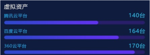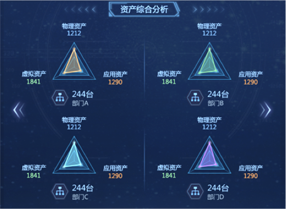 “資產(chǎn)綜合分析”模塊,以部門為單位,對(duì)企業(yè)“物理資產(chǎn)”“虛擬資產(chǎn)”“應(yīng)用資產(chǎn)”數(shù)量統(tǒng)計(jì)分析,并展示各部門內(nèi)不同資產(chǎn)類型的比例關(guān)系和總量。在設(shè)計(jì)版本中,我們改變模塊內(nèi)的布局和交互方式,以雷達(dá)圖方式展示部門內(nèi)部不同資產(chǎn)類型的數(shù)量關(guān)系和總量,并通過顏色來區(qū)分不同部間的數(shù)據(jù)。內(nèi)容擴(kuò)展性方面,采用左右橫向翻頁樣式,可自由設(shè)定系統(tǒng)自動(dòng)翻頁切換和手動(dòng)點(diǎn)擊切換,不僅豐富了頁面展示方式,又增加交互趣味性,數(shù)據(jù)切換過程中動(dòng)效的使用也進(jìn)一步增加界面的科技感和“數(shù)據(jù)之美”。