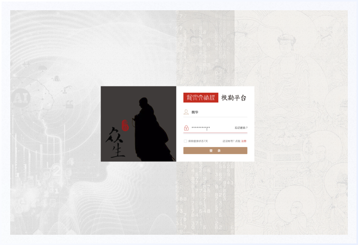 注冊頁是登錄頁的延伸頁面,可以與登錄頁互相切換。使用古典藏經(jīng)圖案作為背景,上面疊加內(nèi)容卡片且居中分布,在整體視覺上符合產(chǎn)品調(diào)性,在操作上完善各種輸入狀態(tài)的反饋。